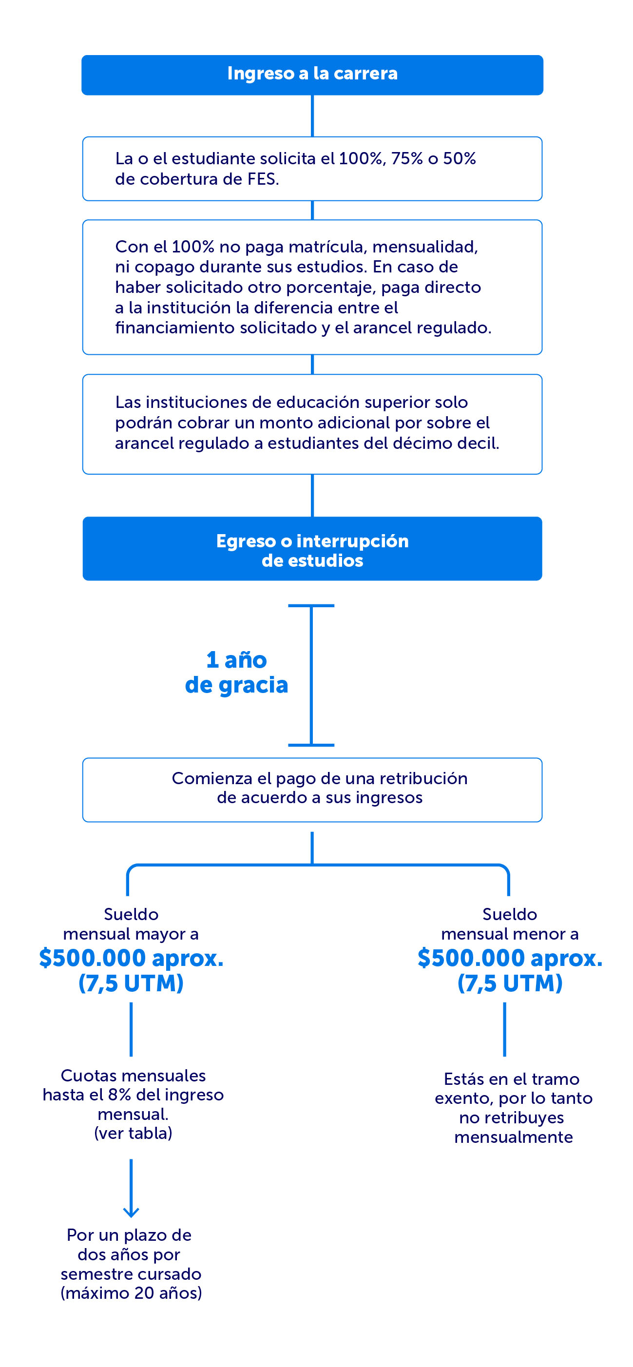 - Las personas contribuirán al FES en proporción a sus ingresos (hasta el 8%), al porcentaje de FES que hayan solicitado (100%, 75% o 50%) y bajo la regla de dos años de contribución por semestre cursado, por un plazo máximo de 20 años.