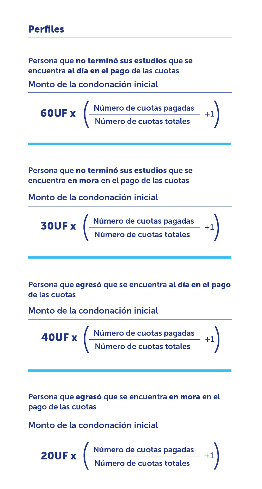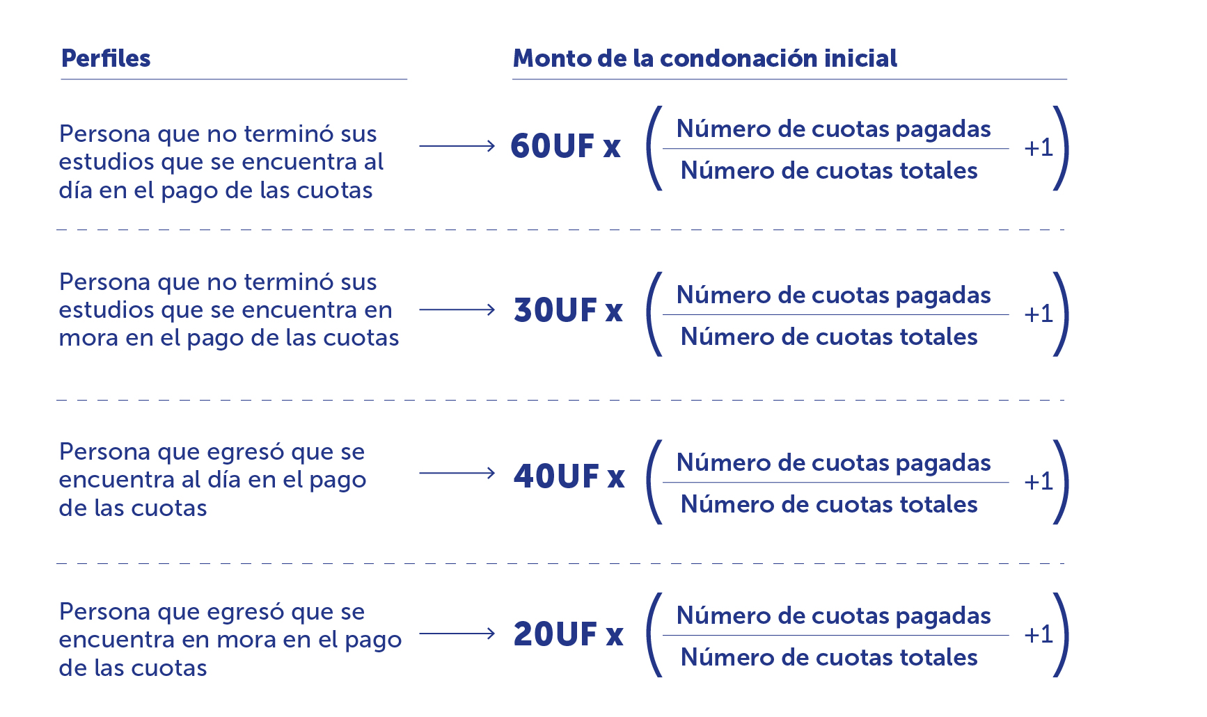 El monto base de condonación en UF de acuerdo a tu perfil debes multiplicarlo por: cuotas pagadas, dividido cuotas totales, más 1. El resultado de esa operación te dará el monto de condonación inicial que debes restar a tu deuda total.