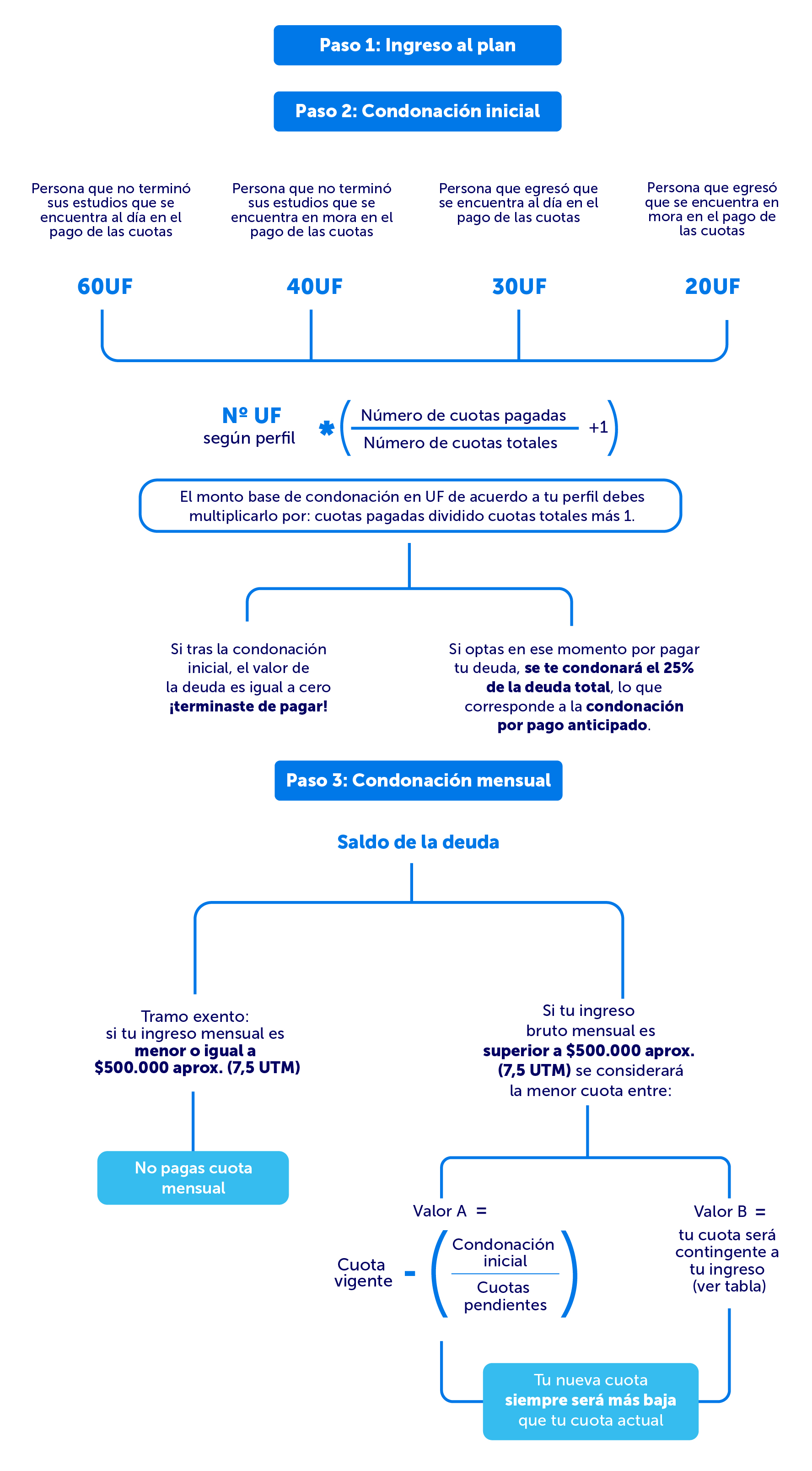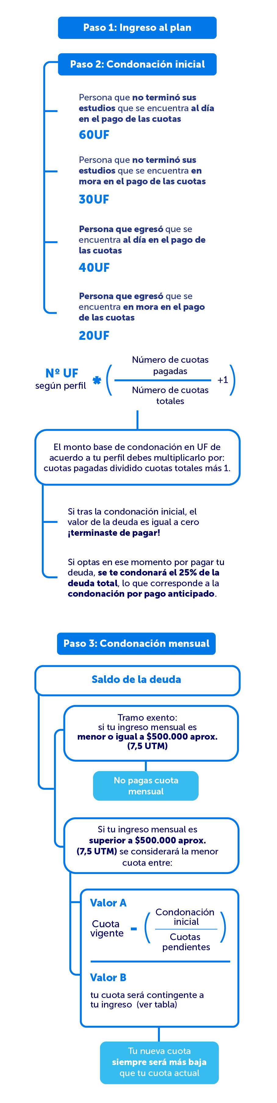 Para las y los deudores de créditos CAE, Fondo Solidario y Corfo, el Plan comprende tres tipos de condonación: inicial, por pago anticipado y mensual.